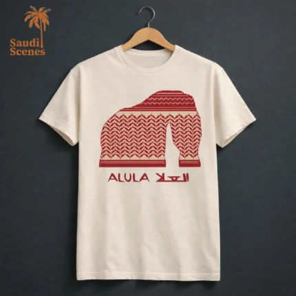 This exquisite AlUla Elephant Rock necklace captures the essence of this iconic Saudi Arabian landmark. The pendant is crafted from natural wood, showcasing the unique shape of the rock formation with intricate details. The wood’s warm tones and natural grain complement the delicate engraving of “ALULA” on the pendant. The necklace is completed with a simple, yet elegant black cord, allowing the pendant to take center stage. This piece is a perfect souvenir or gift for anyone who appreciates the beauty of AlUla and its natural wonders.
