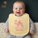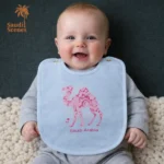 This soft, 100% cotton baby bib features a charming camel design and the inscription “Saudi Arabia.” Available in multiple colors, it’s a stylish and practical way to keep your little one clean.