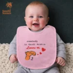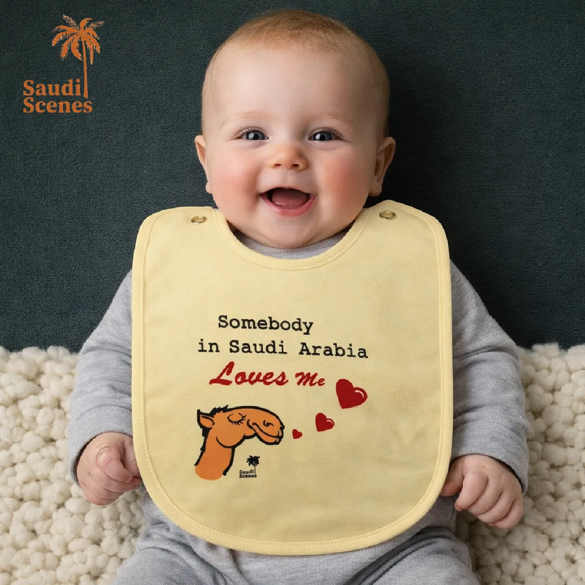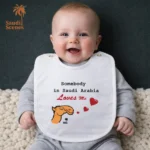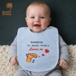 Crafted from soft, 100% cotton for gentle comfort against your little one’s delicate skin, this bib is perfect for mealtime adventures. Featuring a charming camel illustration and the sweet message “Somebody in Saudi Arabia Loves Me,” this bib is a wonderful way to celebrate your baby’s heritage and connection to their roots.