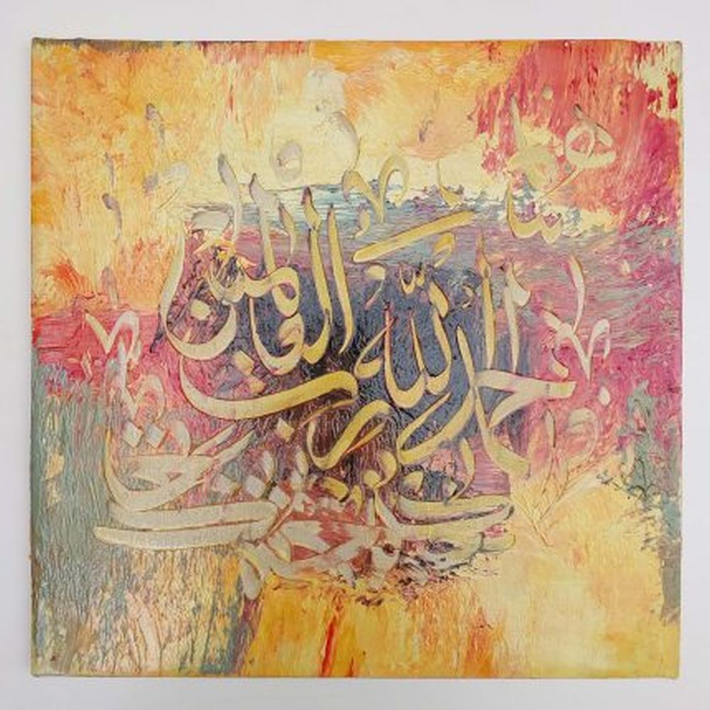 An exquisite calligraphy acrylic painting of a verse from the Holy Quran translating: “(All) Praise is due to ALLAH, Lord of the worlds” الحمدلله رب العالمين. It is the second verse of the first chapter of The Holy Quran “Al Fatiha”.
