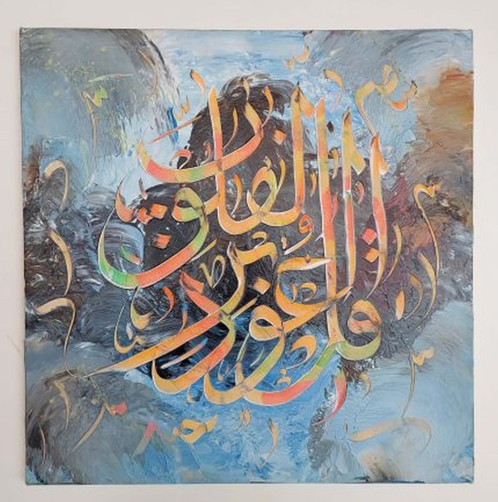Calligraphy is the handwriting of Arabic letters in a fluid matter, written on this canvas is in Arabic  “قل أعوذ برب الفلق” meaning “Say: I seek refuge in the Lord of the Dawn”.