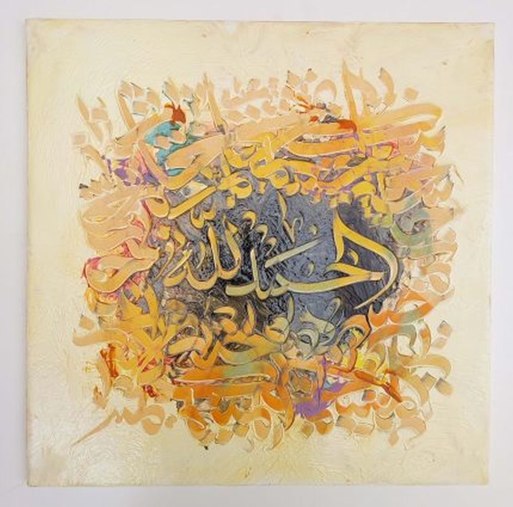 An exquisite calligraphy acrylic painting of a verse from the Holy Quran translating “(All) praise is (due) to ALLAH”, Al Hamdulli”llah الحمدلله