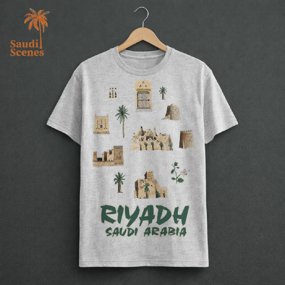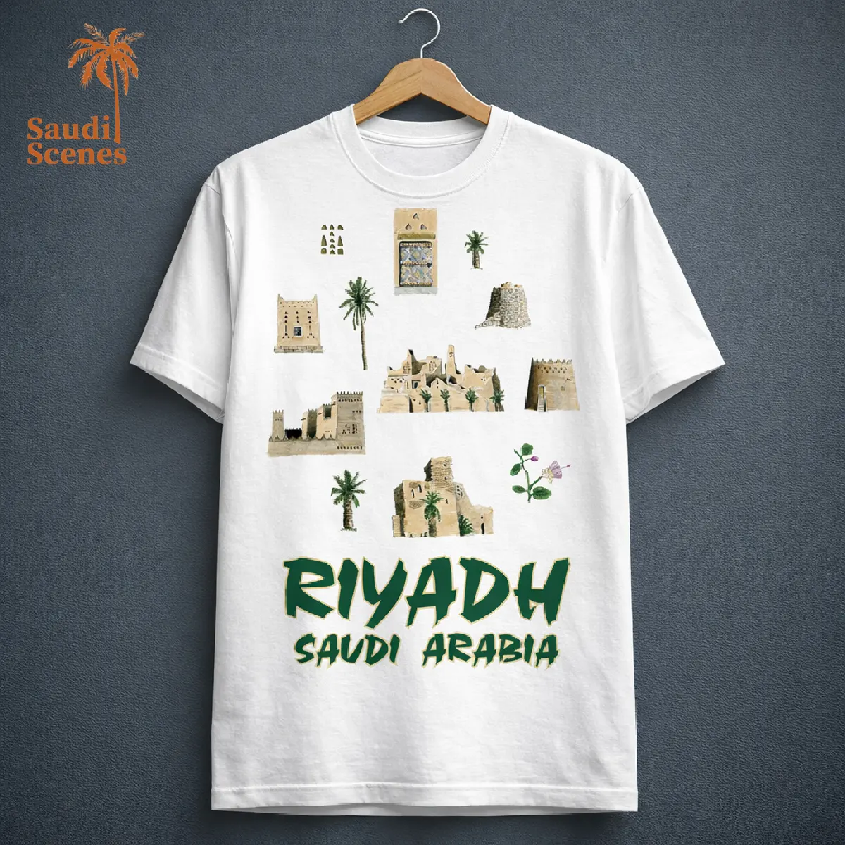 This high-quality t-shirt is a perfect souvenir to capture the essence of your trip to Riyadh, Saudi Arabia. Featuring a beautiful design showcasing iconic landmarks and symbols of the city, this t-shirt is a stylish and comfortable way to remember your unforgettable experience. Crafted with soft and breathable fabric, this t-shirt is perfect for everyday wear, whether you’re exploring the city’s vibrant attractions or simply relaxing at home. The iconic eye-catching design features landmarks like the Masmak Fortress, the Qasr Al-Hokm Palace, and the Kingdom Centre, along with traditional palm trees and lush greenery. This t-shirt is not only a fashion statement but also a conversation starter, allowing you to share your love for Riyadh with others. It’s a must-have addition to your travel wardrobe and a treasured keepsake of your Saudi Arabian adventure.