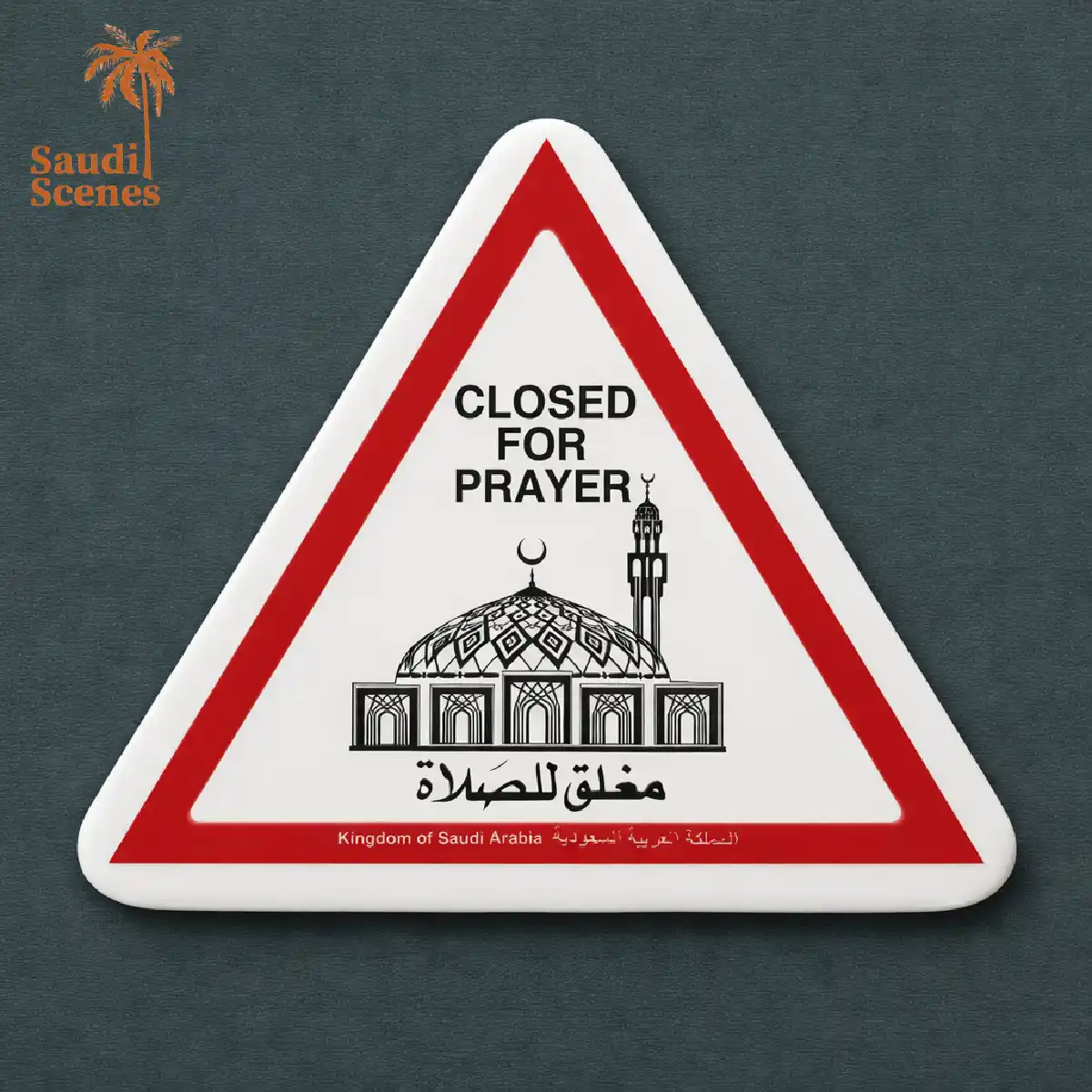 This triangular fridge magnet features a red and white warning sign, commonly used in Saudi Arabia to indicate temporary closures. The sign reads “CLOSED FOR PRAYER” in English and Arabic, and includes an illustration of a mosque. The text “Kingdom of Saudi Arabia” is written at the bottom. This magnet is a useful souvenir for travelers who have visited Saudi Arabia and want to remember their experience.