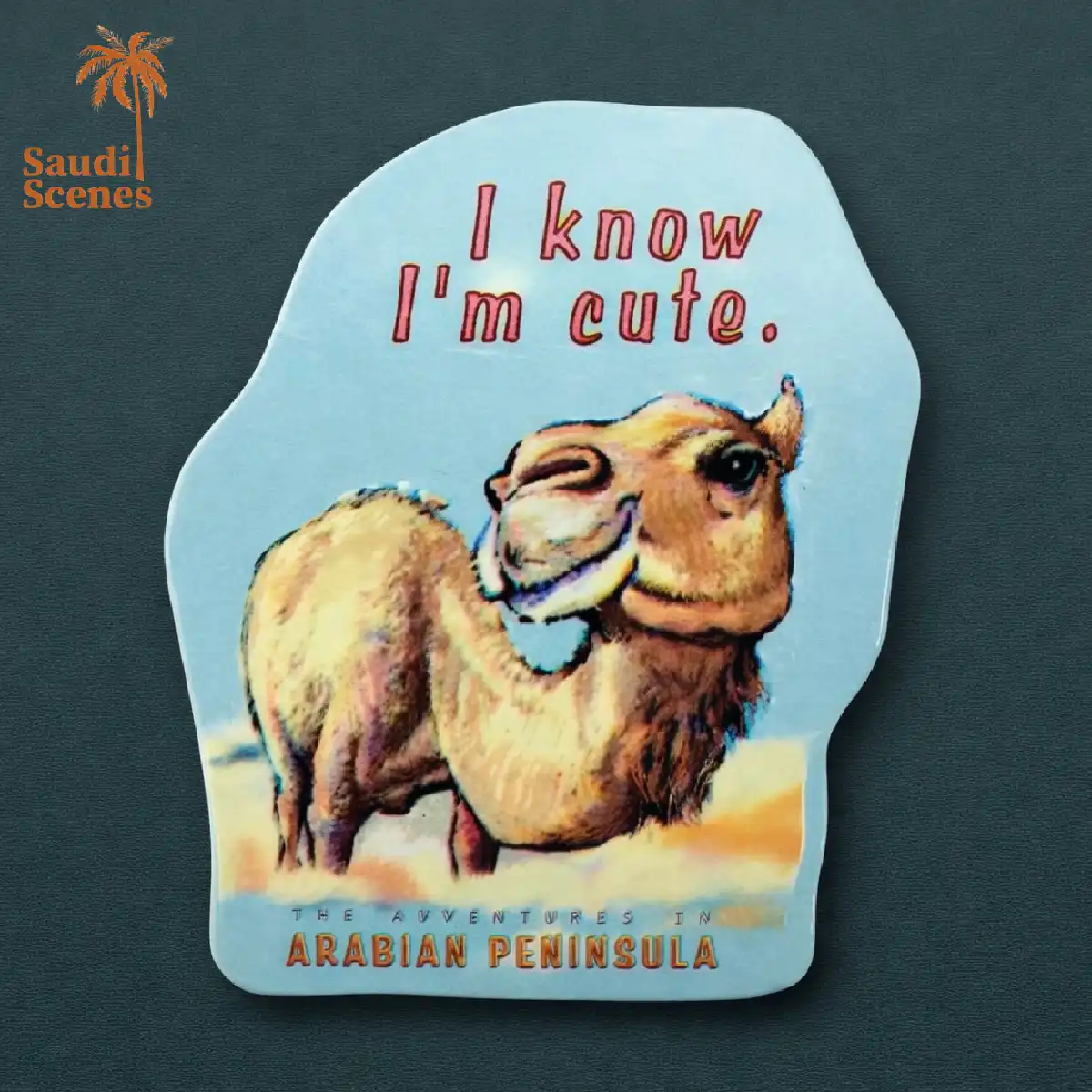 Its a souvenir fridge magnet from Saudi Arabia. It features a camel with the text “I know I’m cute” above it. The magnet is made of plastic, and it has a magnet attached to the back that allows it to be stuck to a metal surface. This fridge magnet is a perfect souvenir for your trip to Saudi Arabia. The magnet features a charming camel with a smug expression on its face. The camel has big eyelashes and pink lips, and it is sporting a colorful headscarf. Above the camel is the text “I know I’m cute” written in a loopy font. The magnet is made of high-quality materials and is sure to add a touch of whimsy to your fridge or any other metal surface.