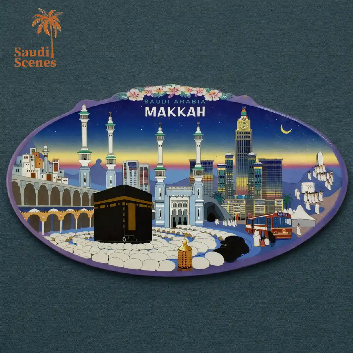 This fridge magnet with a scene of the holy city of Makkah, Saudi Arabia. The magnet features the Grand Mosque, the world’s largest mosque, which surrounds the Kaaba, a cubical structure believed to have been built by Abraham and Ishmael. Muslims believe the Kaaba is the holiest place on Earth. The magnet also features the Saudi Arabian text for “MAKKAH” and “SAUDI ARABIA” written in white. Below that is a company logo, possibly SAPTCO, a Saudi Arabian transportation company. T it is designed to be a religious keepsake or souvenir. These magnets are popular with Muslims who have visited Makkah on Hajj or Umrah pilgrimages.
