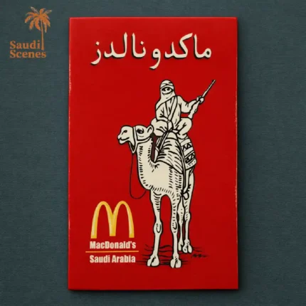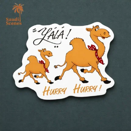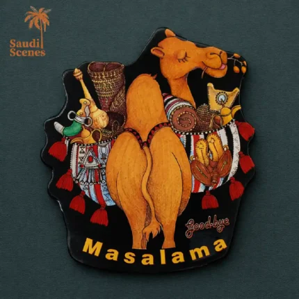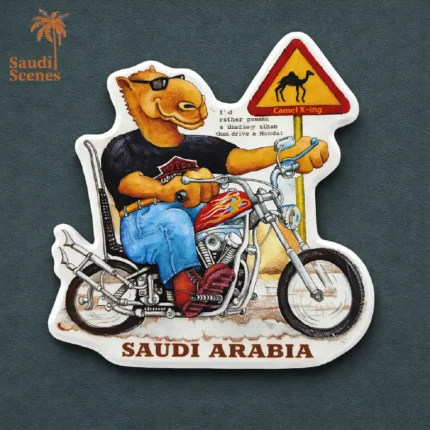 “Scuba Diving Camel Fridge Magnet (mg27)”. It is a souvenir from Saudi Arabia and features a camel scuba diving in the Arabian Gulf Sea. The camel is wearing a scuba mask and fins, and it is swimming underwater. The text on the magnet says “Scuba Diving” and “Arabian Gulf & Red Sea. ”