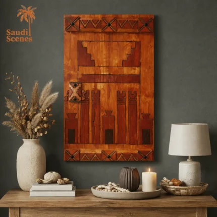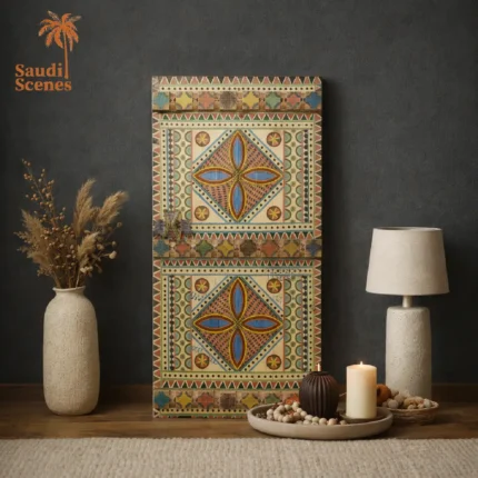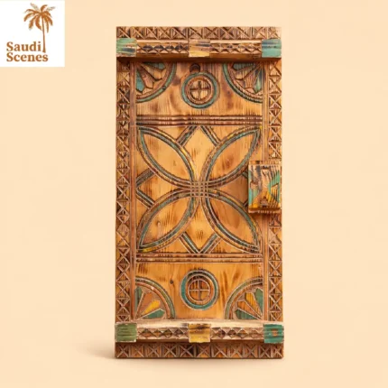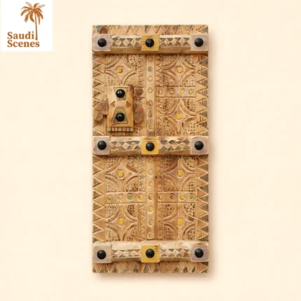This charming handcrafted wooden door, made with local materials, is a beautiful addition to any home. Its intricate carvings and vibrant colors showcase traditional Saudi craftsmanship. The door’s unique design and rustic charm make it a perfect statement piece for your wall. It’s not just a decorative item, but also a piece of Saudi heritage, adding a touch of authenticity to your space.